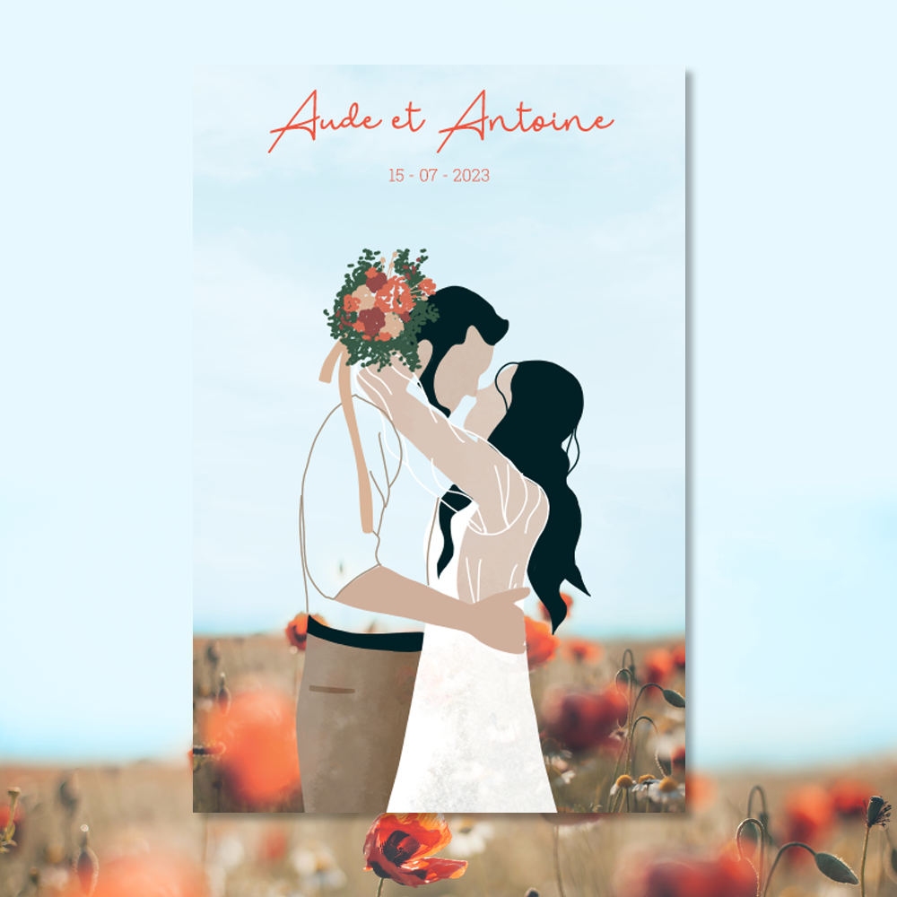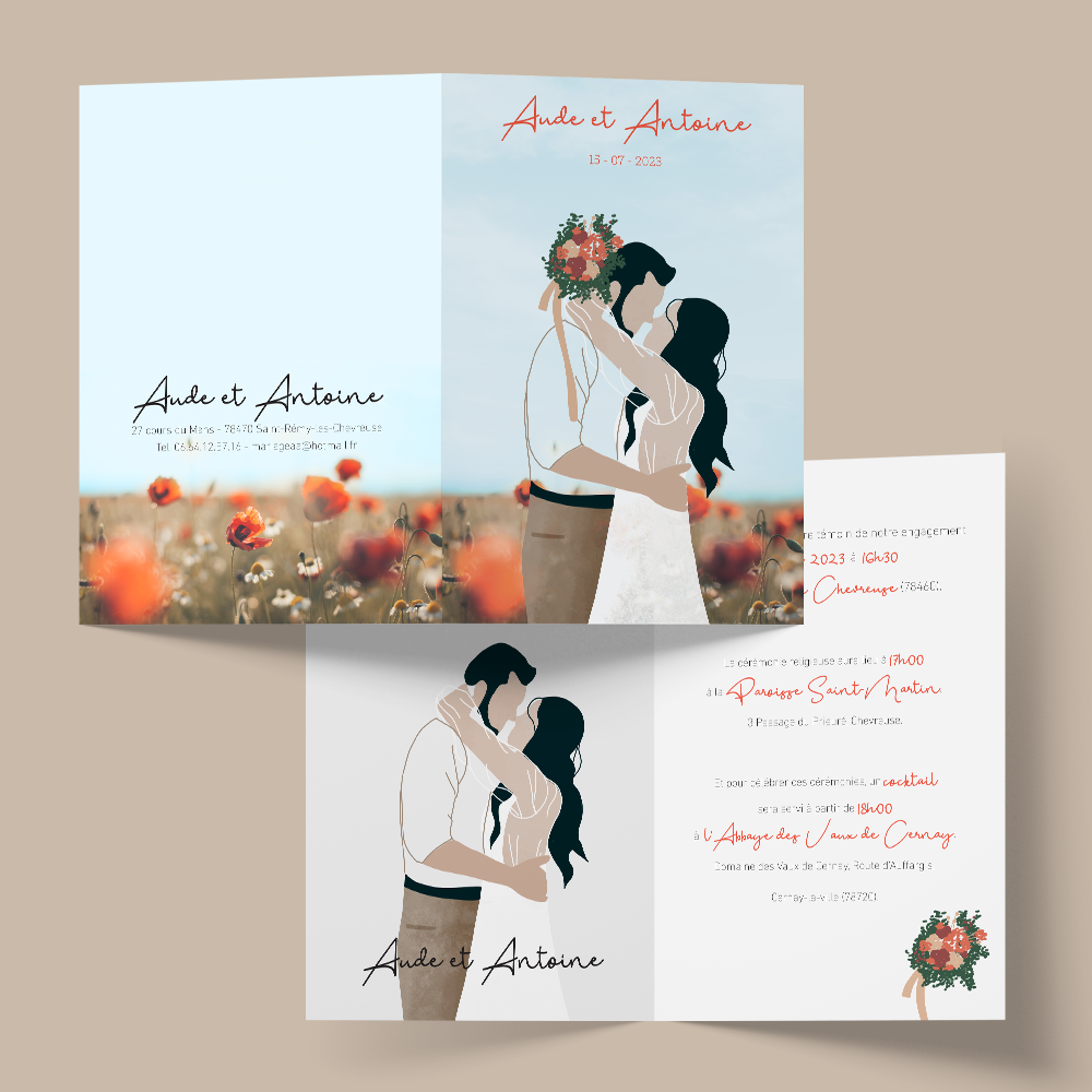 Complicity, romanticism and tenderness ... Invite your loved ones and friends with the "Coquelicots" wedding invitation from the "Composition" Collection. They will be charmed by its originality and elegance. A totally exclusive, innovative and very trendy “photo / illustration” composition.