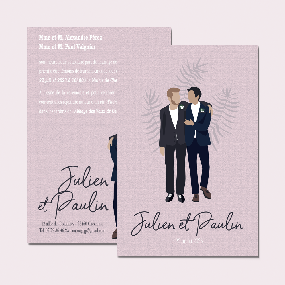 Complicity, tenderness and sensitivity ... Invite your relatives and friends with the wedding invitation "To be a man" from the "To be a man" Collection. They will be charmed by its softness, lightness and its delicate illustration.
